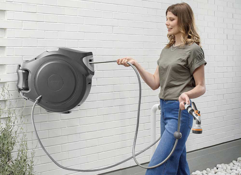 Fissato a parete, permette di riavvolgere automaticamente e comodamente il tubo senza sforzo.