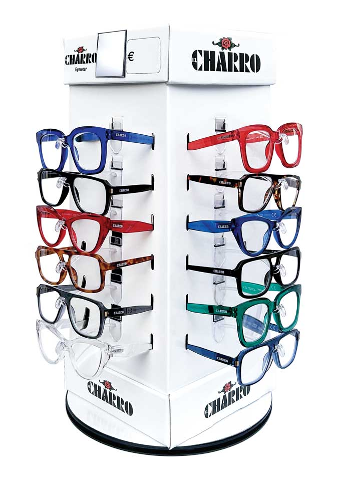 Espositore da 24 pezzi assortiti in due modelli, colori e diottrie.
