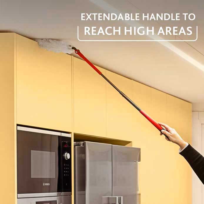 Il manico estensibile, che raggiunge fino a 93 centimetri, offre una pulizia versatile ed efficace, mentre il gancio per fissare il piumino assicura una pulizia senza interruzioni.