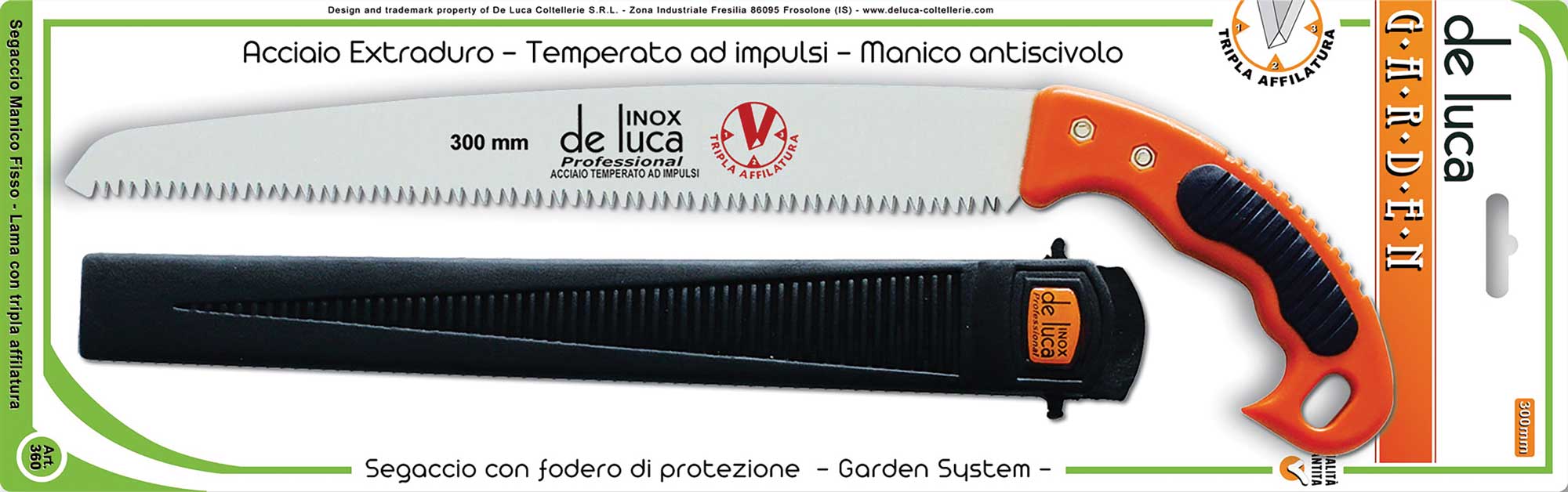 Lama con dentatura in acciaio speciale, manico antiscivolo e fodero con passante per cintura.