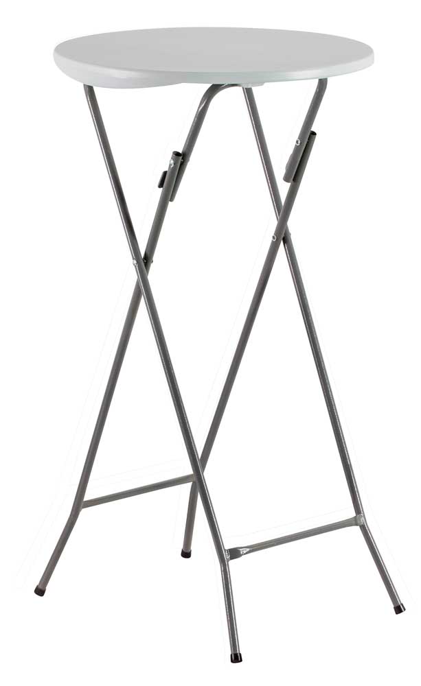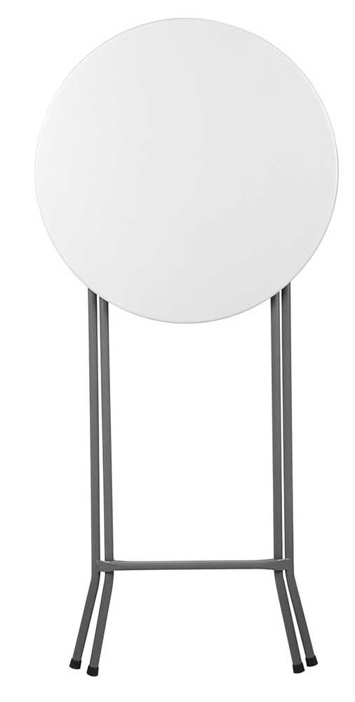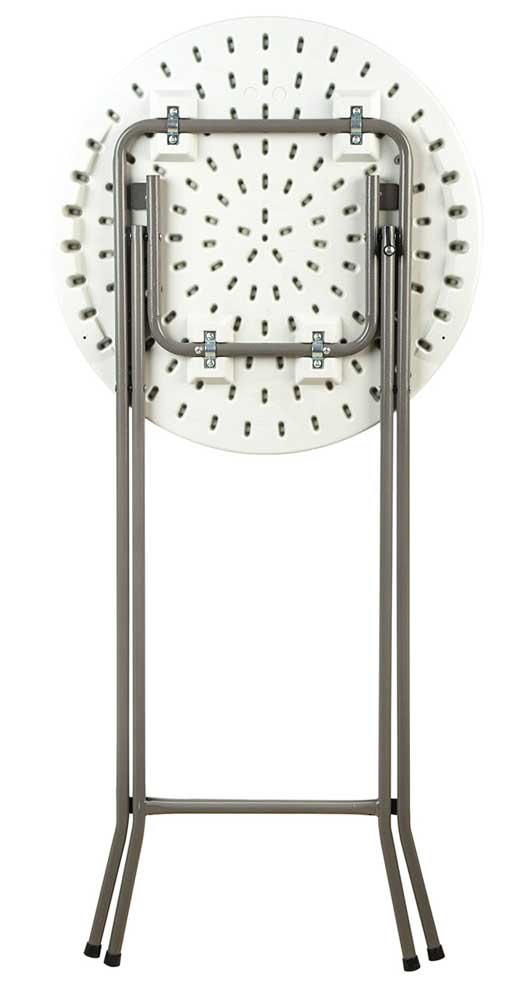 Struttura pieghevole in acciaio verniciato, piano in resina bianco liscio tondo, minimo ingombro quando chiuso.