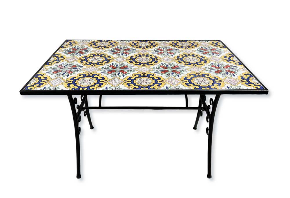 Tavolo con struttura in acciaio trattato per l’esterno (e-coating), ripiano in mosaico di ceramica.