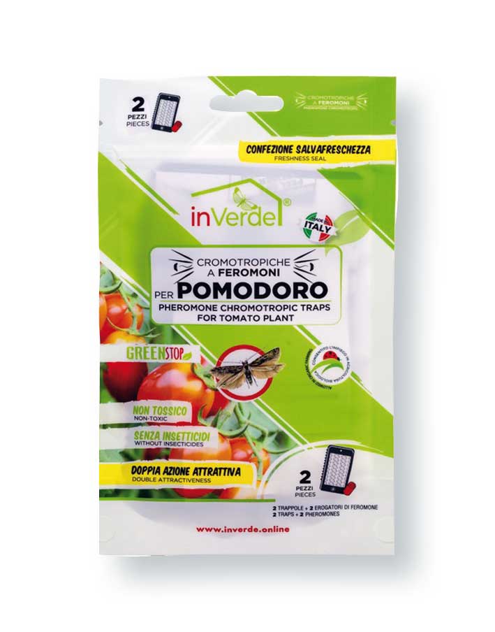 Le trappole adesive cromotropiche a feromoni per pomodoro, sono un dispositivo di monitoraggio della tignola del pomodoro (Tuta absoluta) di facile utilizzo. L’azione cromotropica del colore nero (particolarmente attrattivo per questi insetti) viene potenziata dall’effetto del feromone specifico, così l’insetto viene attirato e rimane invischiato nella colla.